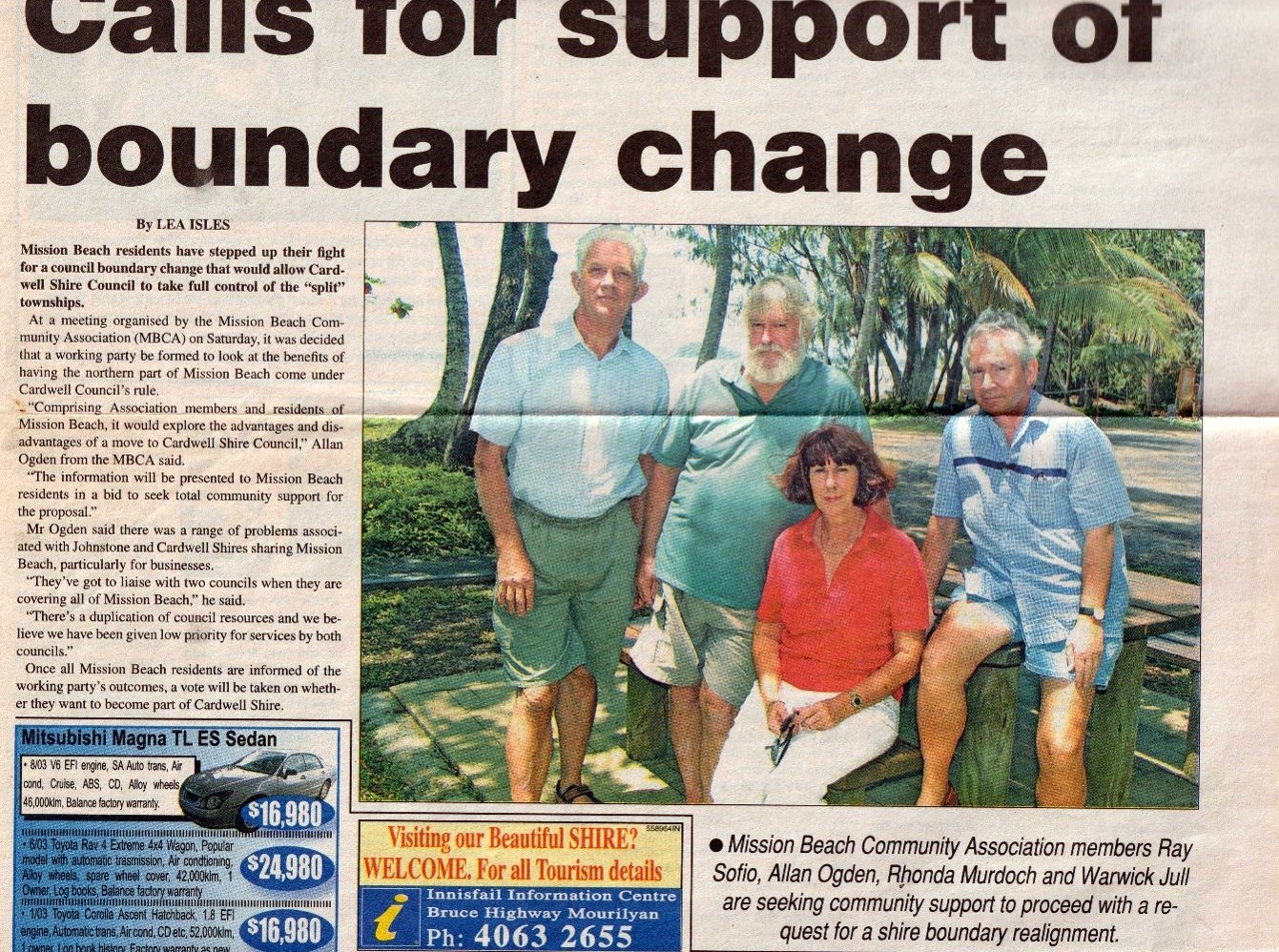 One of MBCA’s earliest priorities was resolving two major frustrations in the community — the need for a unified council and the push for a swimming pool for Mission Beach. Committee members Rhonda Murdoch and Warwick Jull took the community’s concerns directly to Minister Andrew Fraser in Atherton, helping to advocate for the creation of the Cassowary Coast Regional Council in 2008.