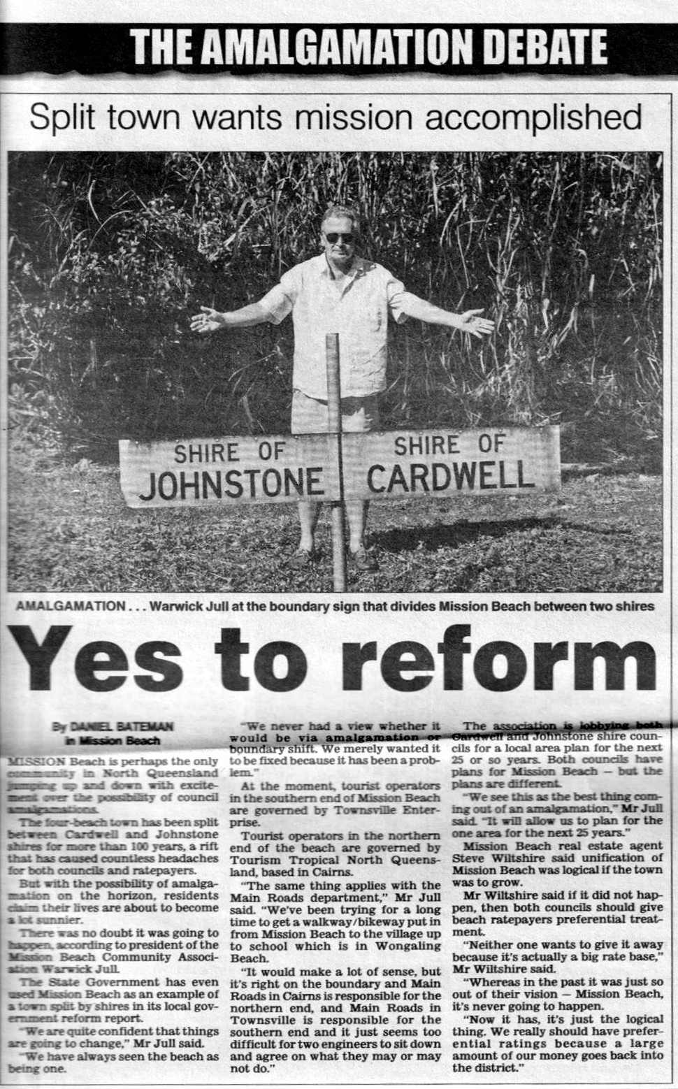 When some residents later called for de-amalgamation, MBCA strongly opposed splitting the council, with then-Mayor Bill Shannon — a former MBCA president — warning of the cost and loss of progress that could follow. MBCA made the case that a united council allowed for better planning, cohesive services, and the realisation of long-term projects, like the Mission Beach Aquatic Centre, which finally opened in 2018 after years of community-driven advocacy.
